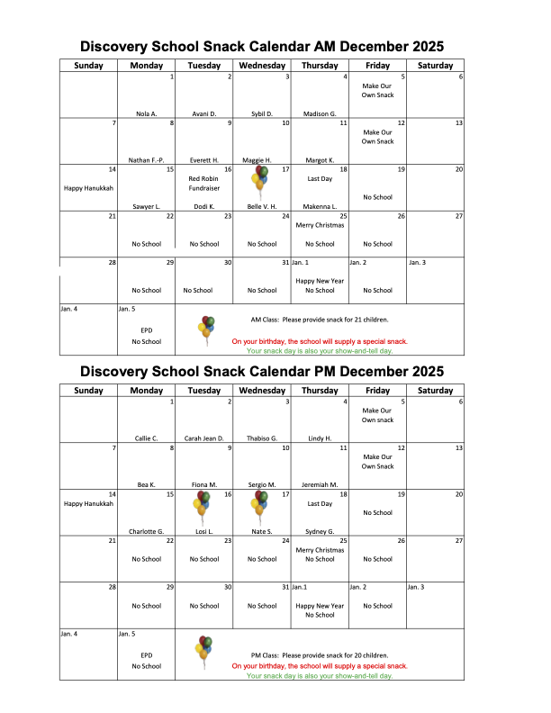 Newsnotes Snack Calendars Snack Ideas Messages to DS Parents Beginning of School Year Calendar Discovery School Academic Calendar 2023-24 Parent Handbook